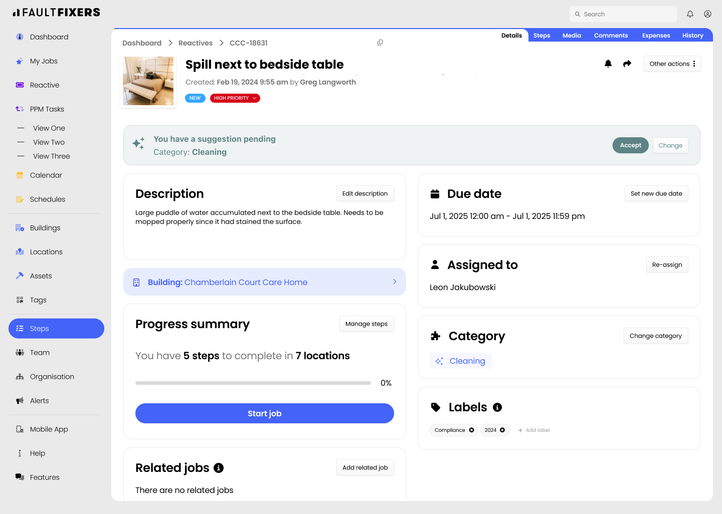 Using the job summary of reported reactive tickets we’ll suggest the most relevant options for you. This helps reporters log jobs more accurately so that they can move faster without having to fret over which category suits the job best.